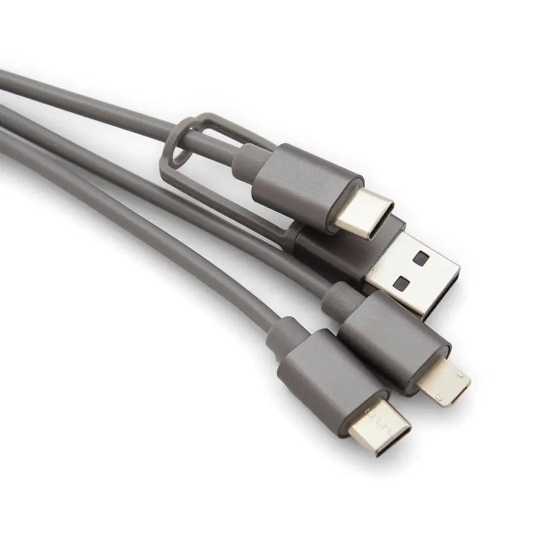Descripción general del producto: Cable 3 en 1 color gris, con una longitud de 12 cm. Incluye cable de entrada TIPO C con adaptador USB A y 2 cables de salida MICRO B / LIGHTING, lo que te permite cargar dispositivos con diferentes tipos de entradas.