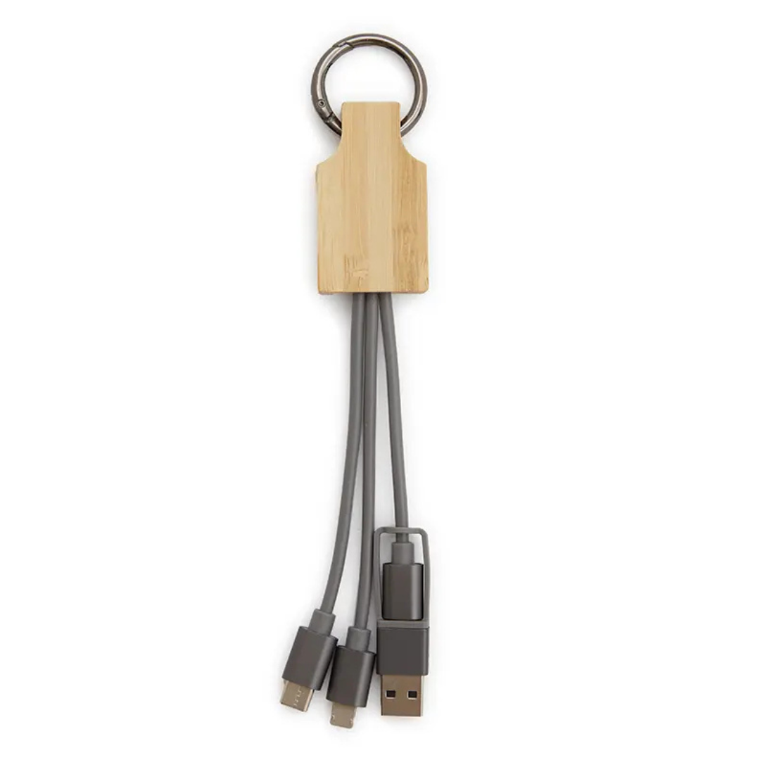 Es el accesorio perfecto para mantener tus dispositivos siempre cargados y listos para usar. Cuenta con un accesorio rectangular de bamboo de donde salen los cables y un gancho de aluminio en tono con los cables.