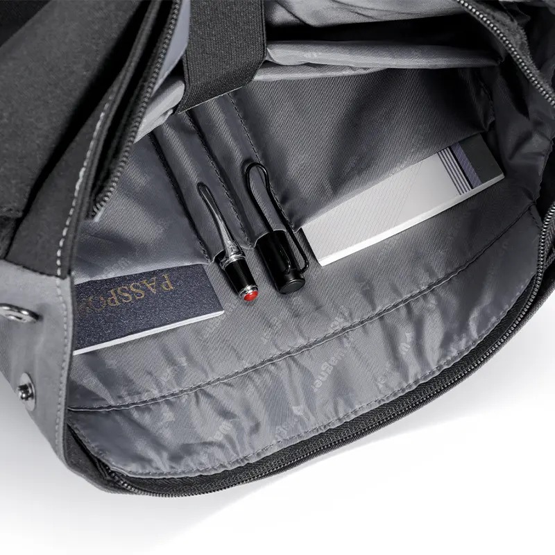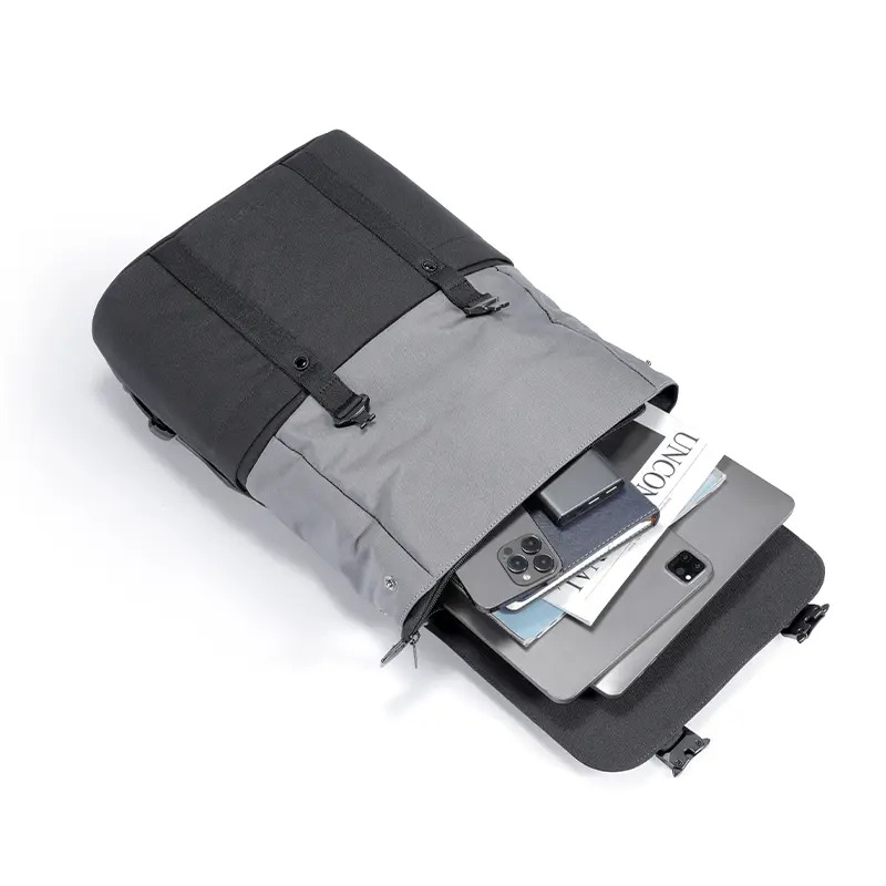 «Mochila urbana hecha a base de poliéster reciclado 450D. Cuenta con un compartimento principal amplio, solapa con broches metálicos, correas ajustables y un diseño bicolor moderno. En su interior cuenta con un espacio para PC, otro para tablet, dos bolsillos pequeños sin cierre y dos para lapiceras. Incluye cinta para ser transportada junto con valija carry on. Ideal para levar todo lo necesario al trabajo, universidad o salidas diarias con estilo y comodidad.