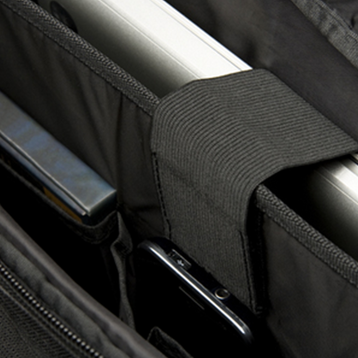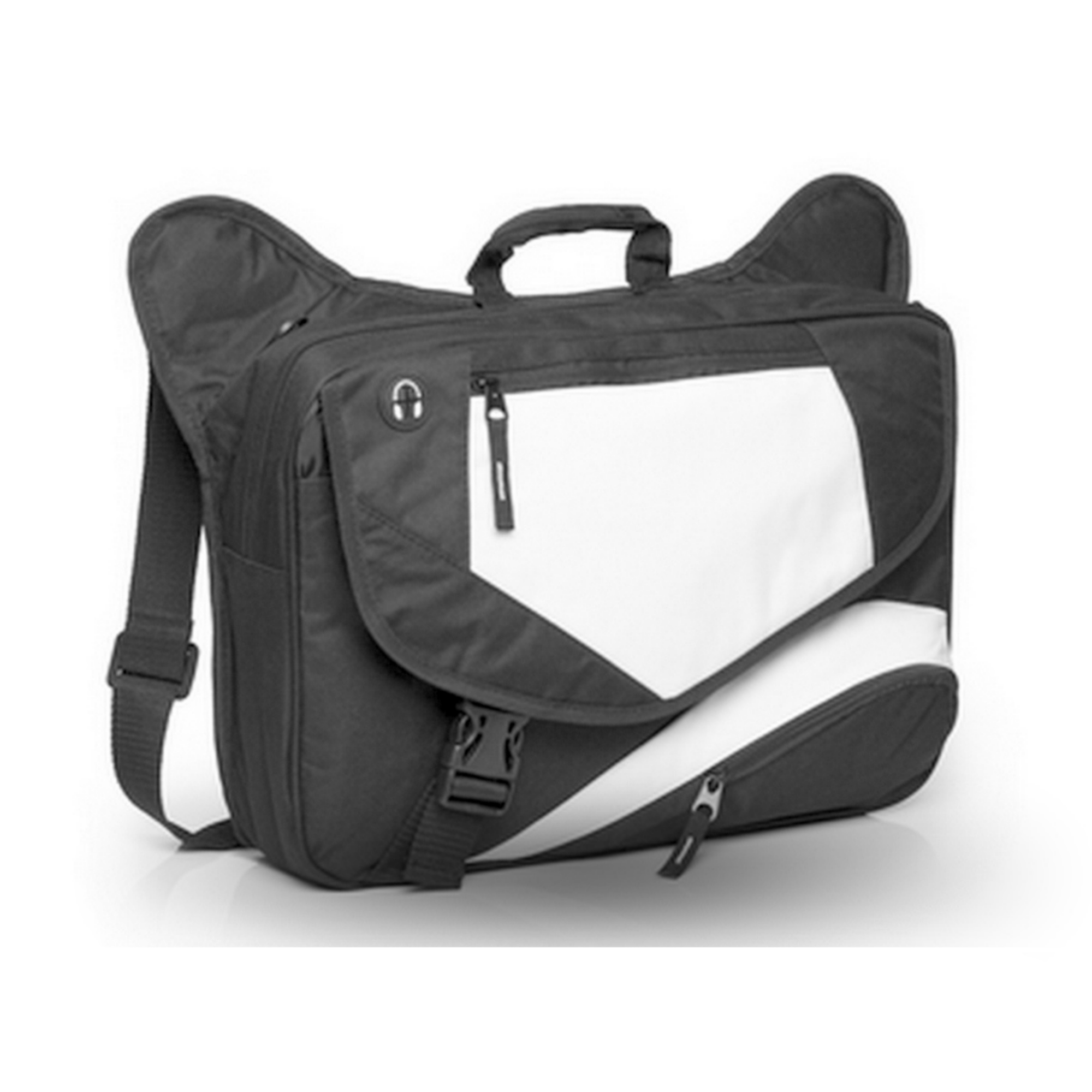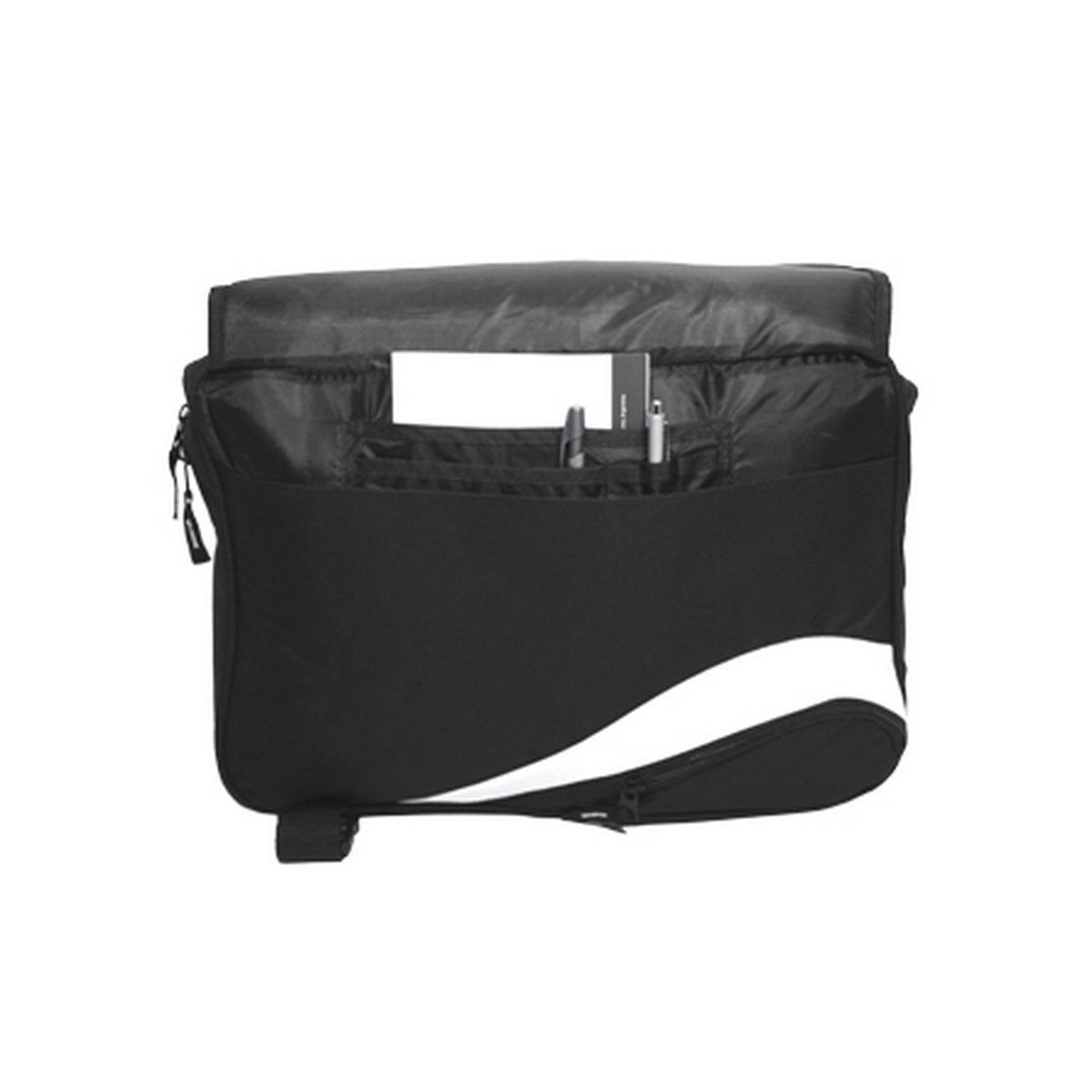 «Maletín PortaNotebook. Confeccionado en Nylon 600D combinado con Ripstop. Compartimento central de gran capacidad. Bolsillo externo frontal con tapa y organizador. Con salida para auriculares y correa extensible. Medida: 30 x 40 x 8 cm. Capacidad: 10 Lts.