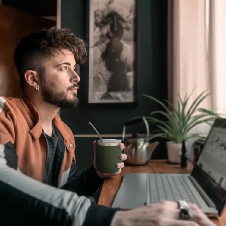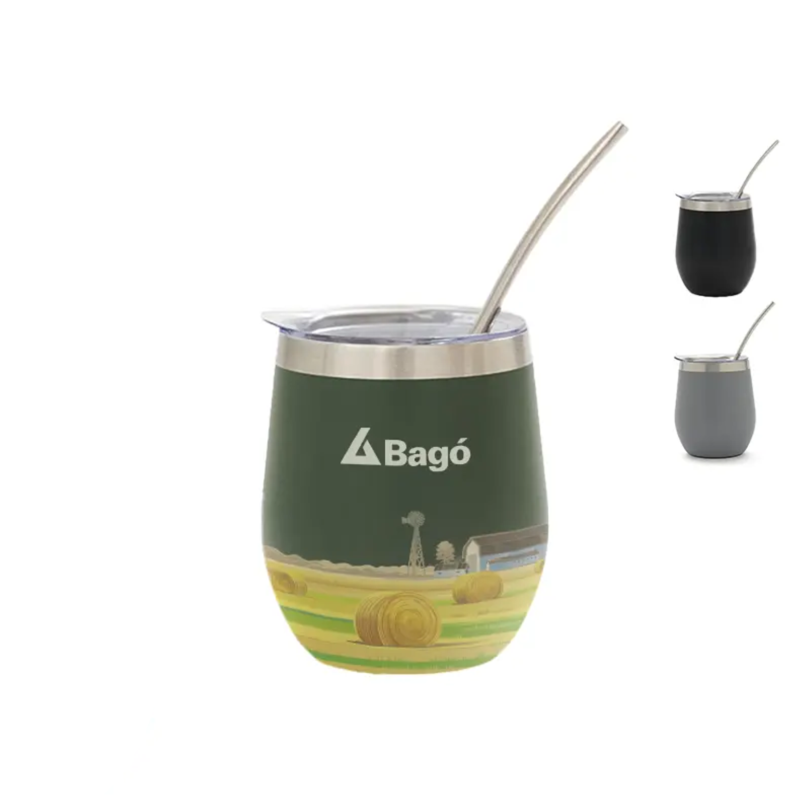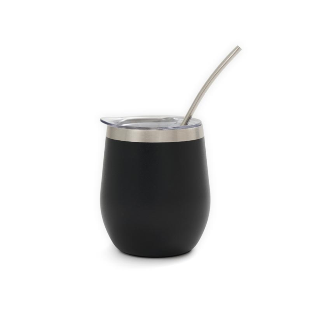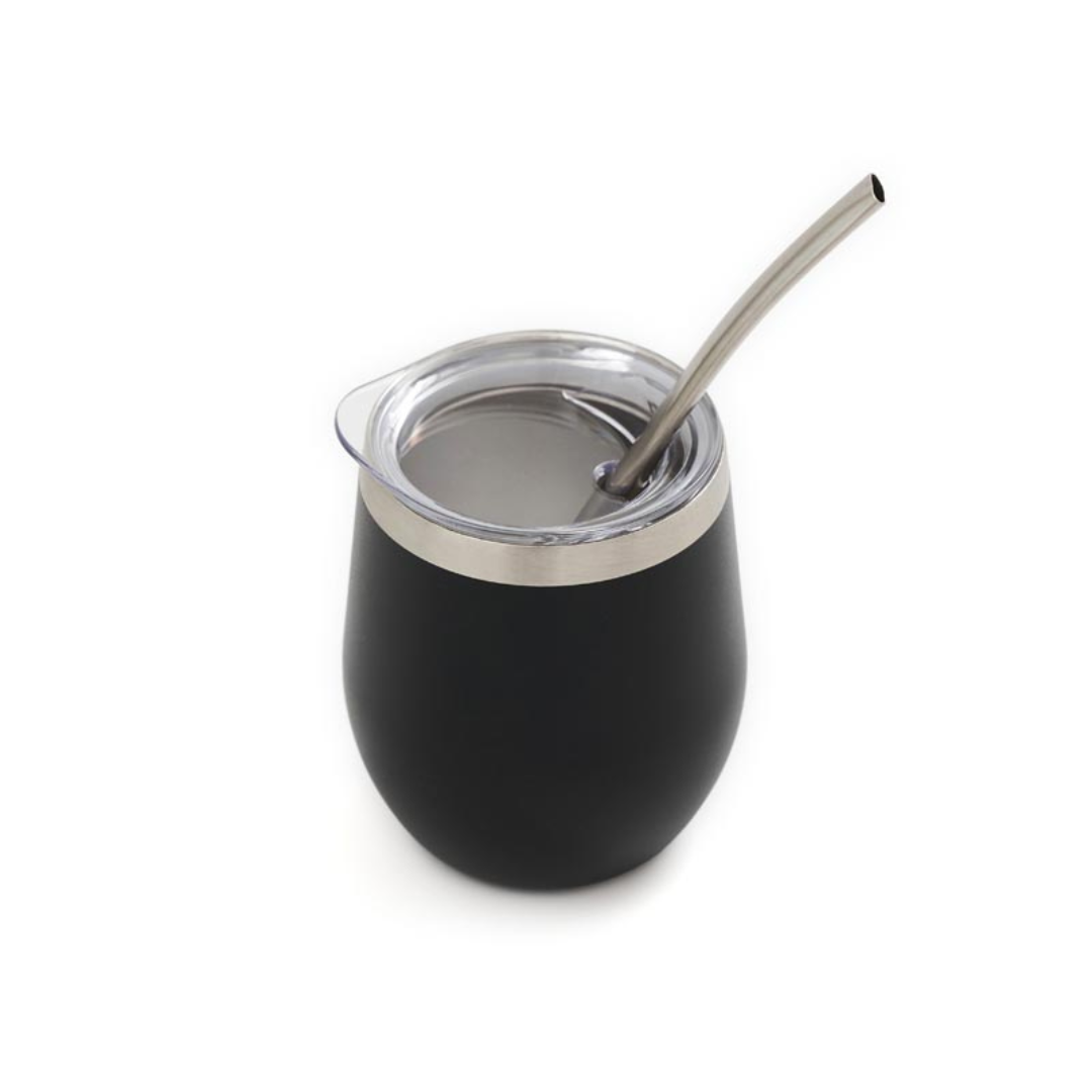 «Mate confeccionado en doble pared de acero inoxidable 304. Cuenta con tapa antiderrame y bombilla de acero. Capacidad: 220 ml.