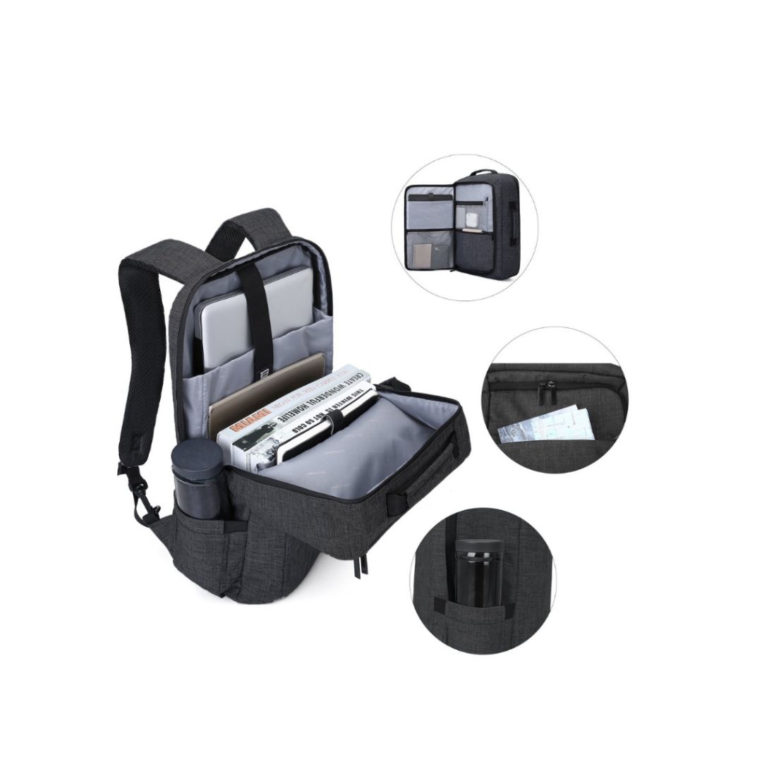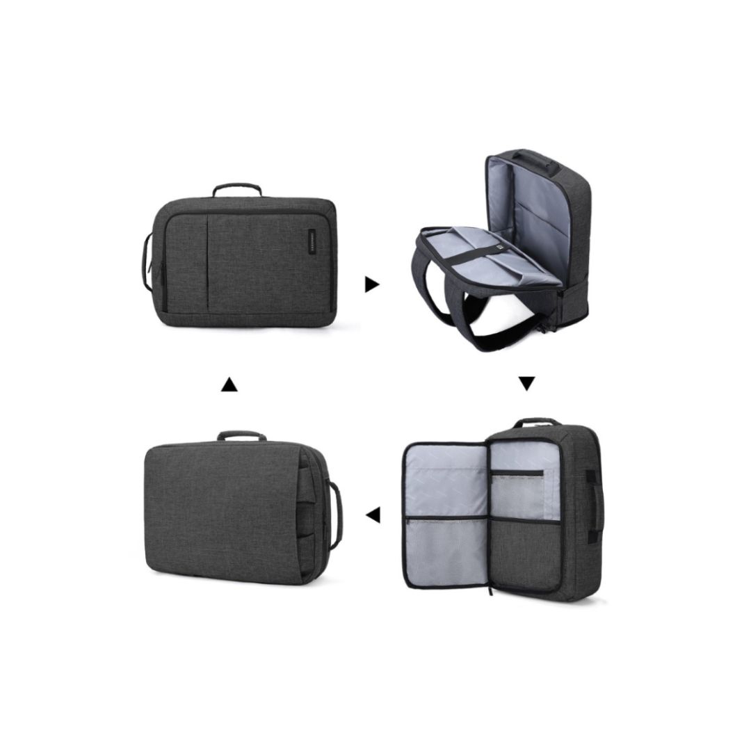 «Uso bidireccional: las correas acolchadas para los hombros se pueden ocultar en el bolsillo trasero, cuando se usa como maletín. Porta notebook hasta 15.6″» Resistente al agua. Múltiples compartimentos. Con espuma antichoque para prevenir los impactos y proteger el interior. Poliéster 300D. Capacidad 18L