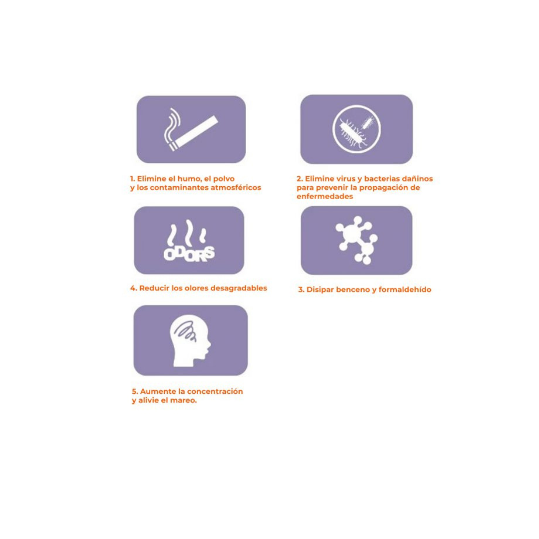 Elimina: Humo, polvo y contaminantes atmosféricos, elimina virus y bacterias para prevenir la propagación de enfermedades.